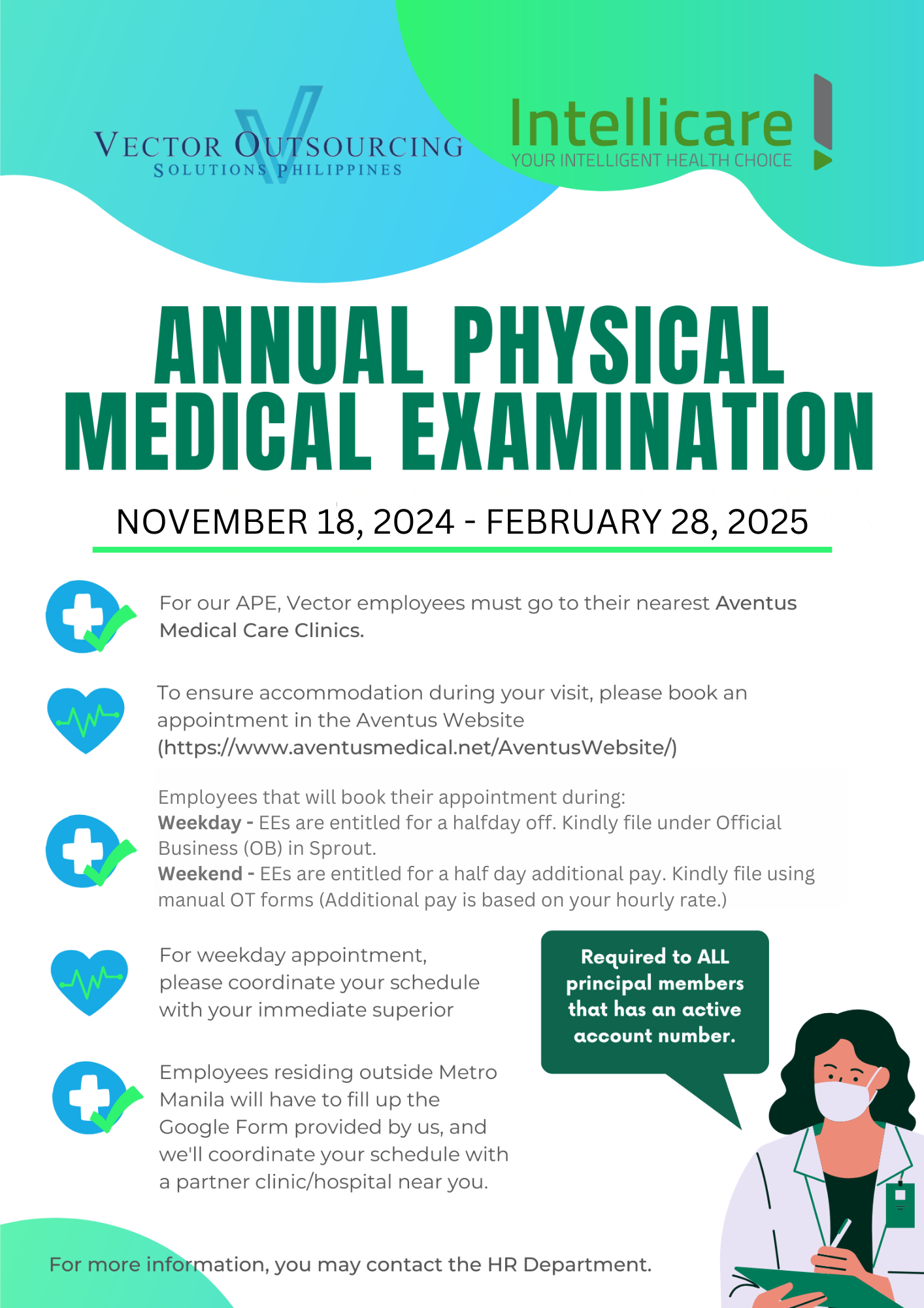 We'd like to announce that we will be conducting our Annual Physical Medical Examination that will run from November 18, 2024, to February 28, 2025, with our partner HMO provider Intellicare.